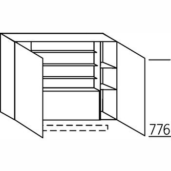 Bovenkast voor afzuigkap, 2 deuren, breed 90 cm, hoogte 78 cm en diepte 35 cm (exclusief deurdikte). Kruidenrekje en getoonde indeling uitsluitend bij een vlakschermafzuigkap. Bij blokdesign afzuigkap wijzigt de indeling.