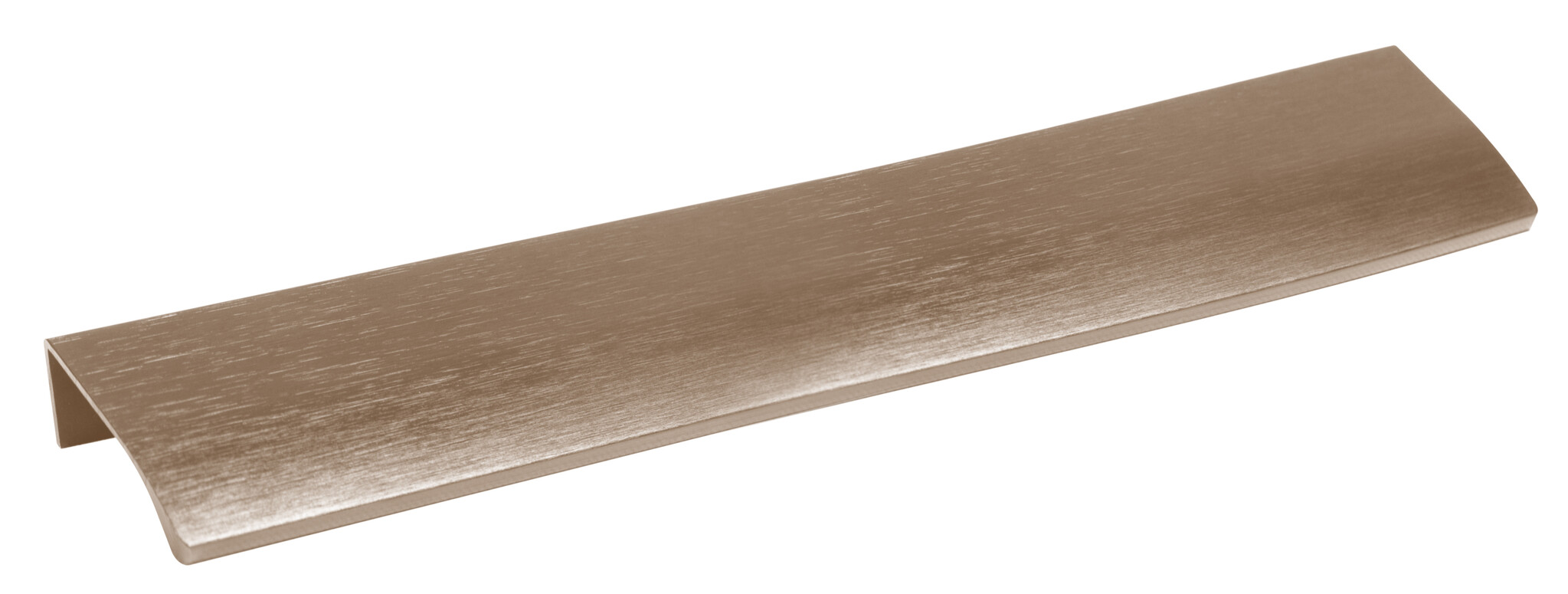 Greep van geborsteld bronskleurig metaal. Greephoogte: 1,8 cm. Boormaat: 160 mm. De greep valt over het front en wordt vanaf de achterzijde op het front vastgeschroefd.