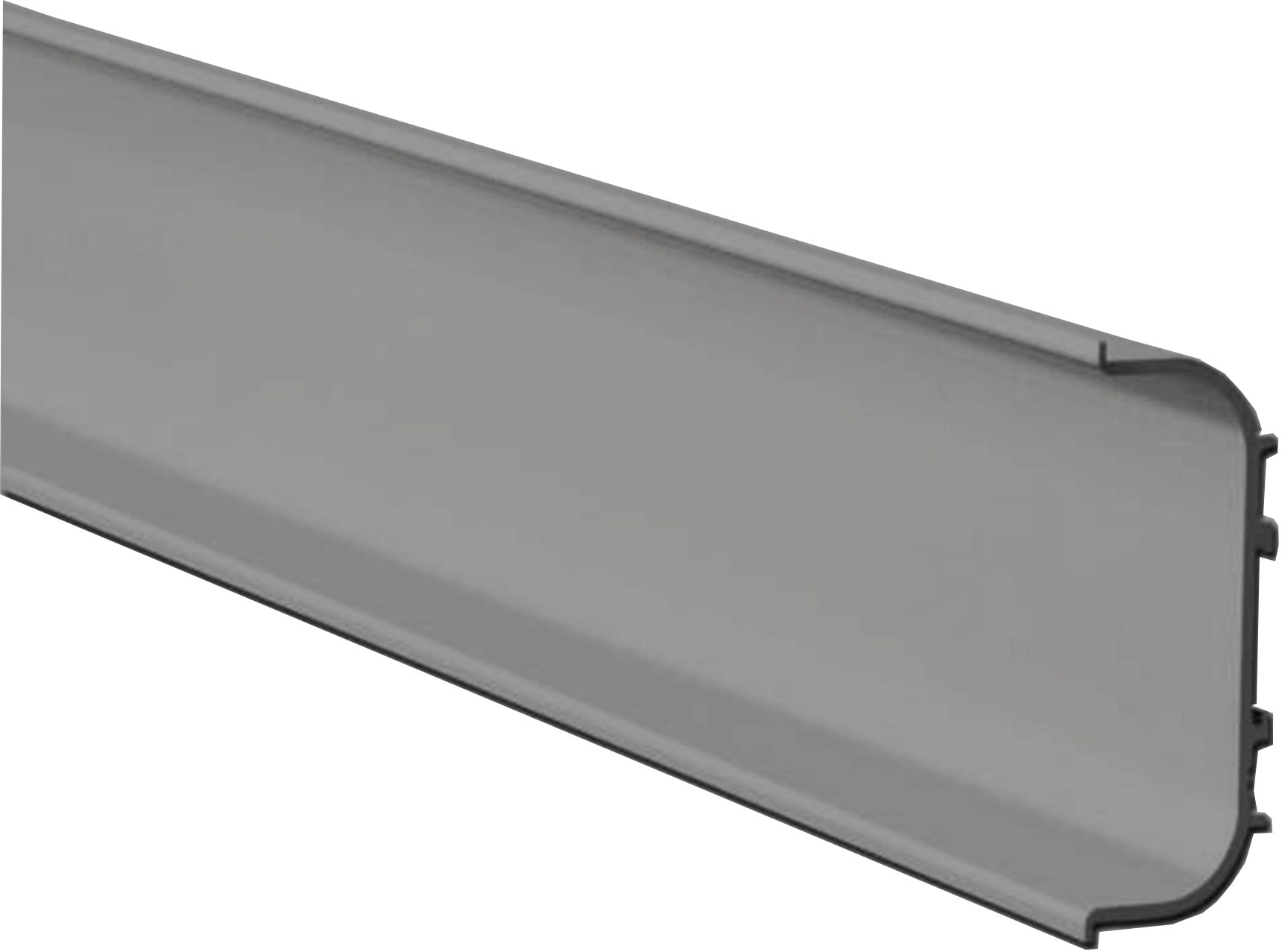 Horizontale greeplijst van gecoat aluminium, inclusief bij greeploze keukenkasten. Voorzien van kunststof eindkappen en hoekverbinders, soms met kleine overlengte. Lengtes en hoeken worden geleverd volgens de besteltekening van het keukenontwerp.