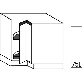 Hoekonderkast, korpusbodem naar onder geplaatst, korpushoogte 80,9 cm, 2 deuren, 2 draaibodems 270° met gesloten metalen reling en 360° draairichting. Hoog: 78 cm (excl. plint). De kleur van de greeplijst verschilt in tint van de overige greeplijsten.