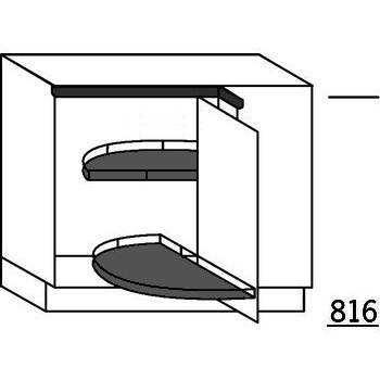 Hoekonderkast, blind gedeelte links of rechts, 1 deur, 2 halfronde draaibodems met gesloten metalen reling. Hoog: 84,5 cm (excl. plint). Korpus 100 cm breed. Hoekpasstuk 90º wordt los meegeleverd.