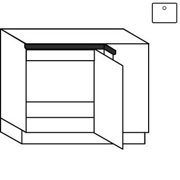 Hoekonderkast voor spoelbak, 1 deur, 1 binnenblende, blind gedeelte links of rechts. Hoog: 78 cm (excl. plint). Korpus 100 cm breed, achterwand tijdens de montage op maat zagen leidingwerk. Hoekpasstuk 90º wordt los meegeleverd.