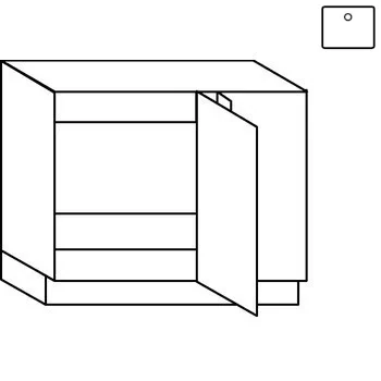 Hoekonderkast voor spoelbak, 1 deur, 1 binnenblende, blind gedeelte links of rechts. Hoog: 78 cm (excl. plint). Korpus 100 cm breed, achterwand tijdens de montage op maat zagen leidingwerk. Hoekpasstuk 90º wordt los meegeleverd.