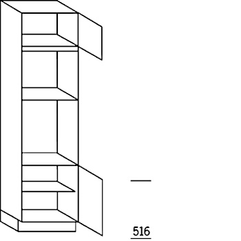 Hoge keukenkast, 1 maatdeur, 1 inbouwnis 36 - 45 cm hoog, 1 inbouwnis 58,5 - 59,5 cm hoog, 1 deur, 1 legplank. Hoog 207,8 cm (excl. plint).