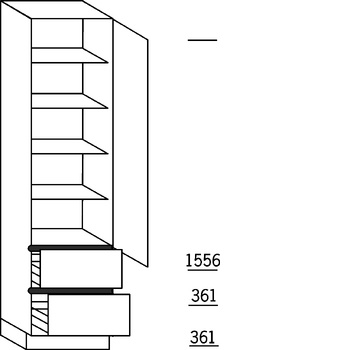 Hoge keukenkast, 1 deur, 2 korven, 4 legplanken. Hoog 233,8 cm (excl. plint). Let op: min. plafondhoogte 247 cm (kantelen kast).