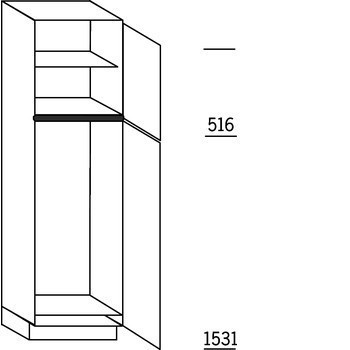 Hog keukenkast, 1 deur, 1 deur met inbouwnis 122,5 - 140 cm hoog, 1 legplank. Hoog 207,8 cm (excl. plint).