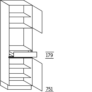 Hoge keukenkast, 1 maatdeur met Push-to-Open (los meegeleverd), 1 inbouwnis 38,5 - 45 cm hoog, 1 lade, 1 deur, 3 legplanken. Hoog 207,8 cm (excl. plint).