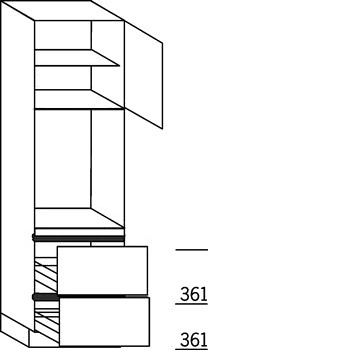 Hoge keukenkast, 1 maatdeur met Push-to-Open (los meegeleverd), 1 inbouwnis 58,5 - 59,5 cm hoog, 1 vaste blende, 2 korven, 1 legplank. Hoog 207,8 cm (excl. plint).