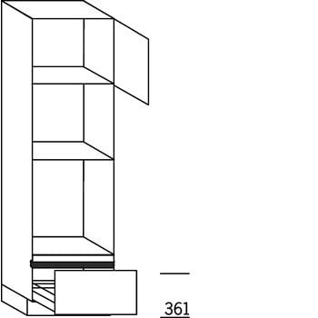 Hoge keukenkast, 1 maatdeur met Push-to-Open (los meegeleverd), 1 inbouwnis 38,5 - 45 cm hoog, 1 inbouwnis 58,5 - 59,5cm hoog, 1 vaste blende, 1 korf. Hoog 207,8 cm (excl. plint).