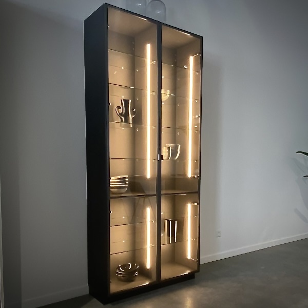 Meerprijs voor lineaire LED-verlichting aan beide binnenzijden van het korpus van een hoge kast met glasdeur en glazen legplanken. Verlichting in energieklasse F, uitgevoerd in zwart. Voorschakelapparaat dient apart te worden besteld.