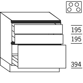 Onderkast voor inbouw kookplaat, 2 laden, 1 korf, 1 metalen beschermplaat boven de lade. Hoog 84,5 cm (excl. plint).