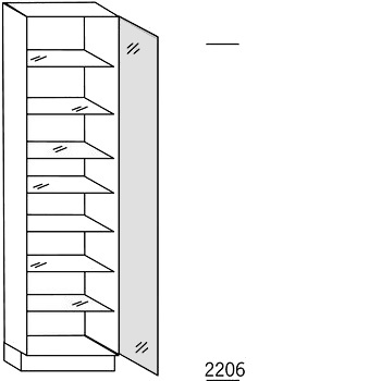 Ondiepe staande kast, 1 deur met smal metalen kader (2 cm breed) met greep en glaspaneel, 1 vaste plank, inclusief 6 glazen legplanken. Hoogte 220,8 cm (excl. plint), diepte 35 cm (excl. deurdikte).