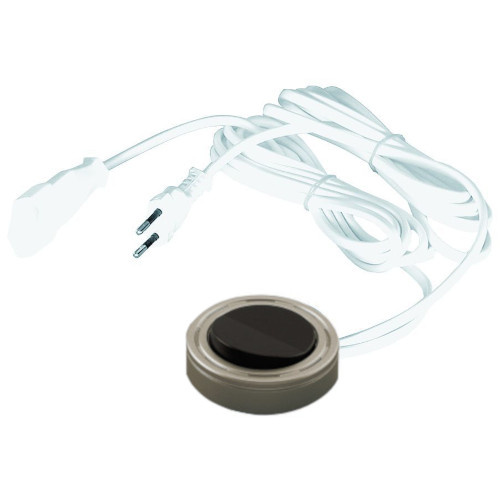 Klikschakelaar voor verlichting, met RVS-kleurige behuizing en zwarte schakelaar. Voltage: 230 V.
