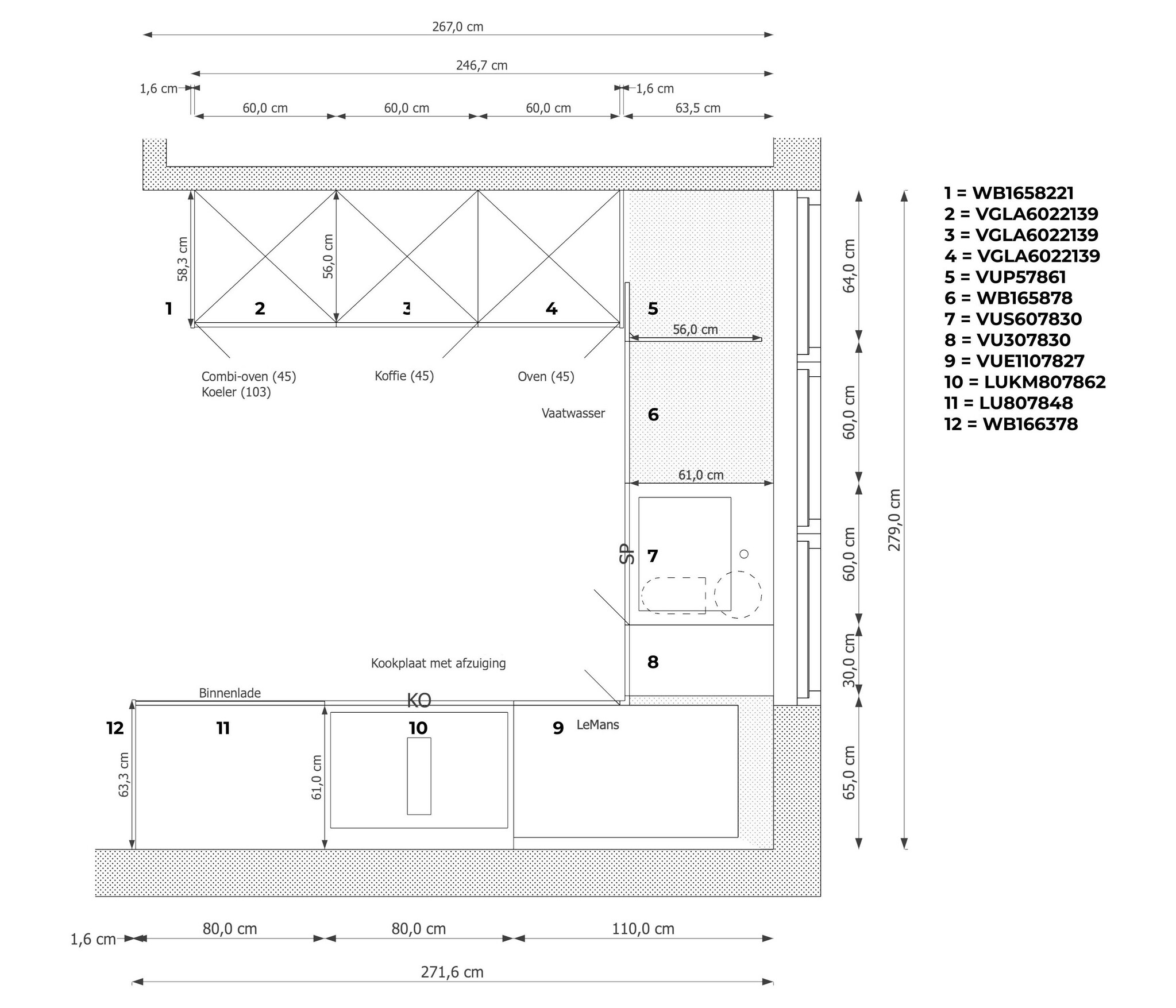 Bovenaanzichttekening: Stuur een tekening van de opstelling van de keukenkasten, waarbij de kasten genummerd zijn. Per kast dient het artikelnummer van de kast vermeld te worden (zie het voorbeeld hieronder).